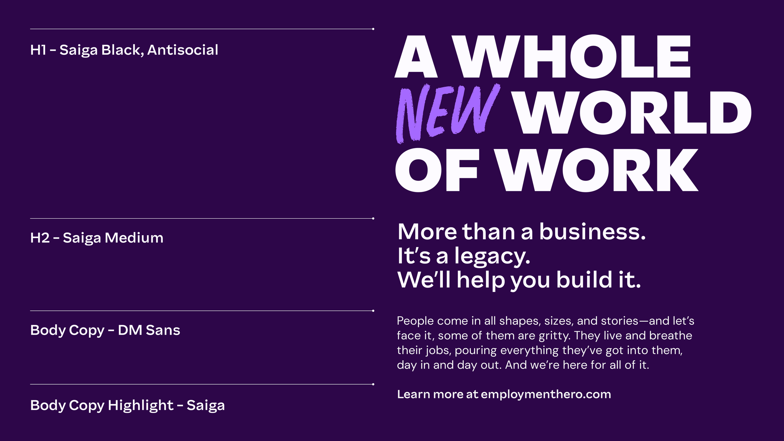 From clean and efficient to vibrant and engaging, our fonts work together to capture the brand's versatility and personality, perfectly complementing Employment Hero's visual identity.