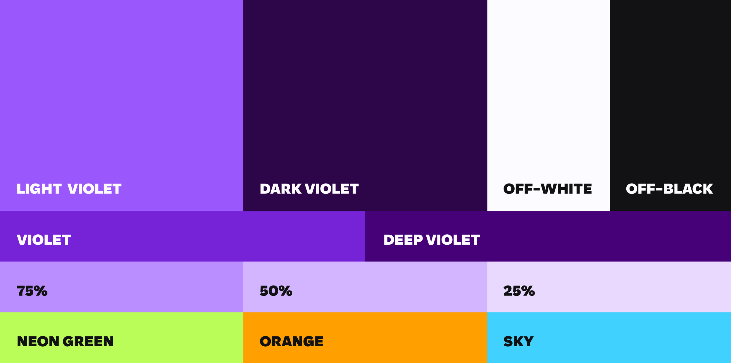 The palette consists of two distinct violets to strengthen our presence across every channel, supported by tints and accent colours to highlight key elements and CTAs.